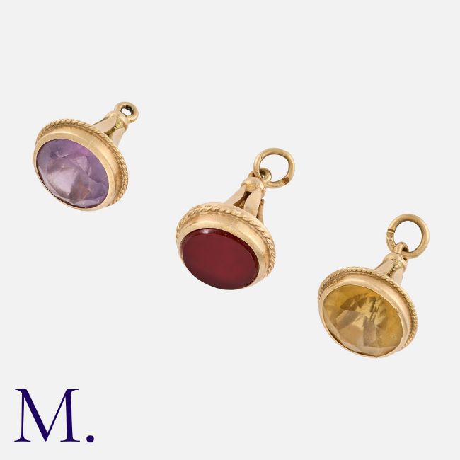 A Set of Three Gemstone Fob Seals in 9K yellow gold, one set with amethyst, one with citrine and one with agate. Hallmarked for 9ct gold. Size: 2.0cm Weight: 11.6g
