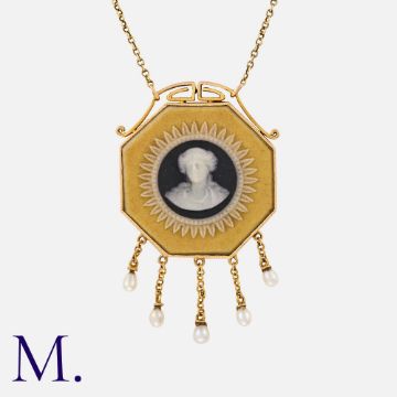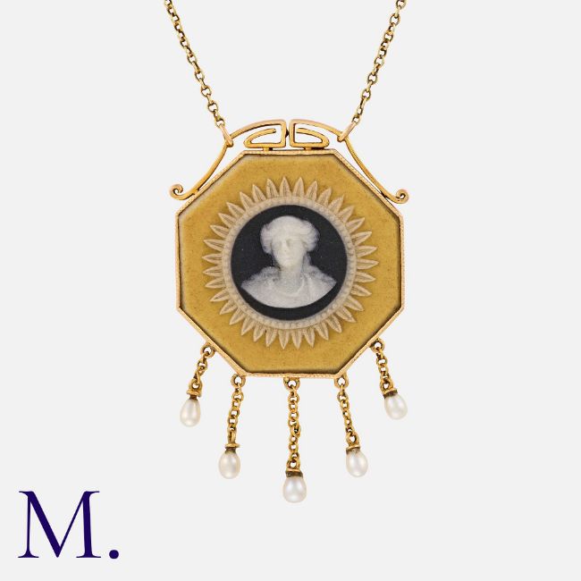 A Cameo Pendant Necklace in 15k yellow gold, set with an octagonal cameo, accented by five pearl set tassels, to a fine chain terminating in a bolt ring clasp. Marked 15ct. Size: Pendant: 2.8cm Chain: 40cm Weight: 5.4g.