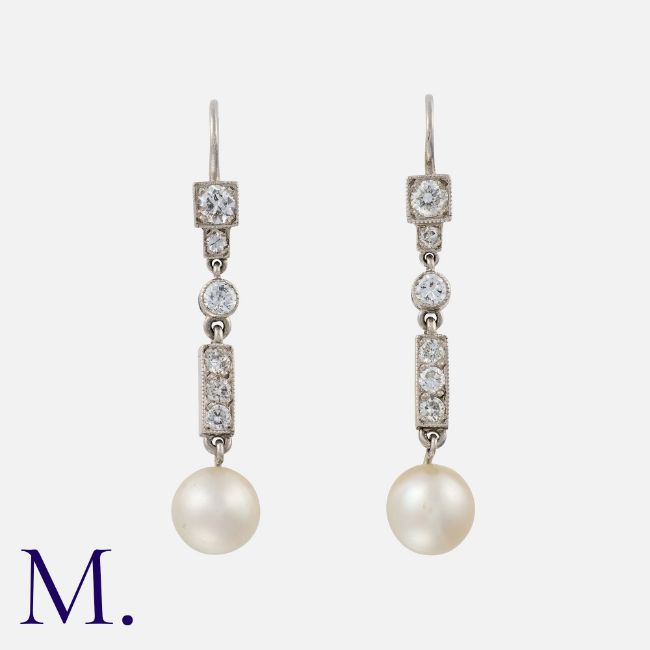 A Pair of Diamond and Pearl Drop Earrings, each designed as a series of articulated links, set with approximately 0.25ct of diamonds, each terminating in a button pearl (approx. 6.5mm diameter). Accompanied by a verbal assessment stating that the pearls are natural saltwater. Size: 3.3cm drop Weight: 4.2g