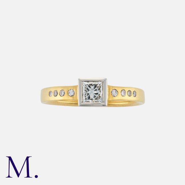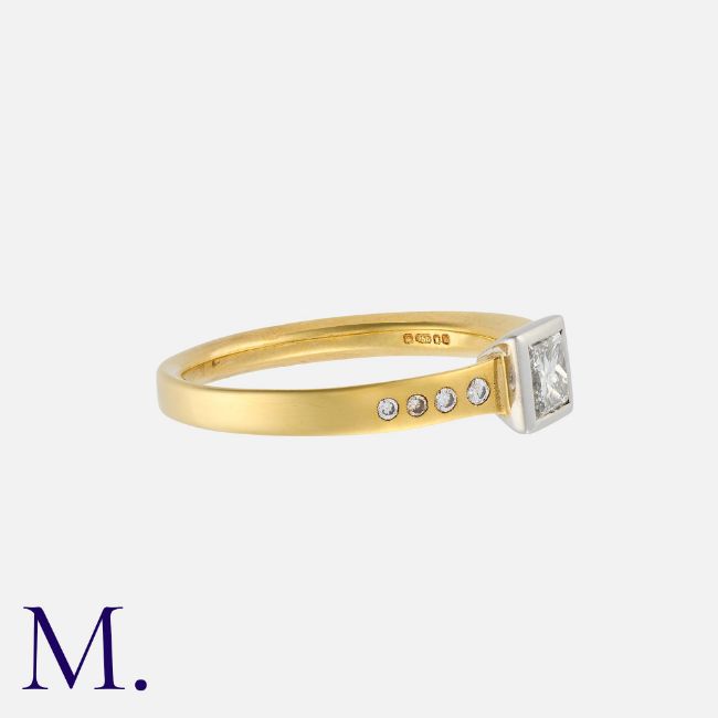 A Diamond Solitaire Ring in 18K yellow and white gold, set with a princess cut diamond weighing 0.41ct, together with diamond-set shoulders (weighing approx. 0.30ct in total). Hallmarked for 18ct gold. Size: M Weight: 3.2g