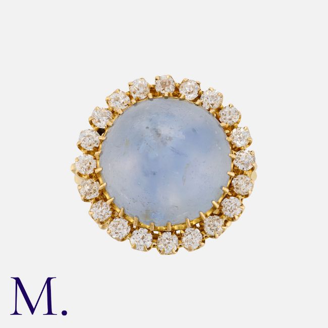 A Sapphire and Diamond Ring in 18K yellow gold, set with a cabochon blue sapphire weighing approx. 26.0ct with brilliant cut diamonds in surround weighing approx. 1.0ct. Stamped '18ct' and tests indicate 18ct gold. Size: Q1/2 Weight: 15.9g