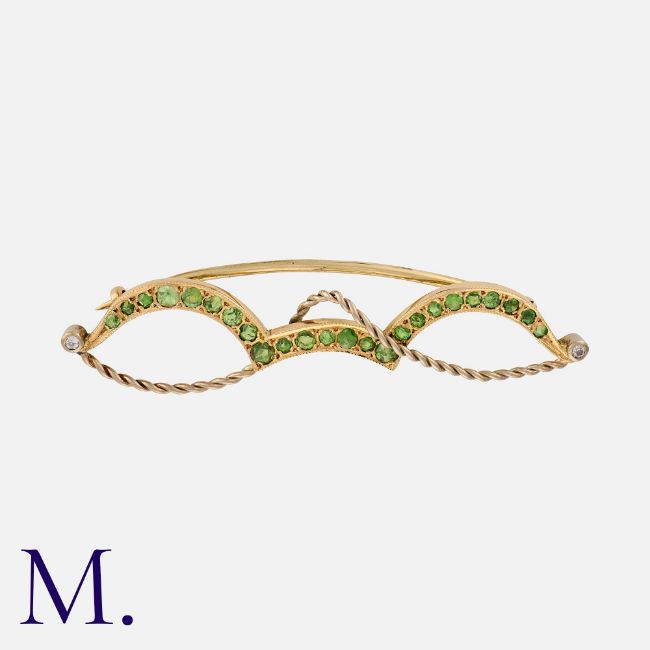 A Demantoid Garnet And Diamond Brooch in yellow and white gold, of abstract design, set throughout with round cut demantoid garnets, terminated at each end by a round cut diamond. Unmarked, tests indicate 15 carat gold. Size: 5.4cm Weight: 4.1g.