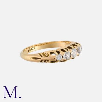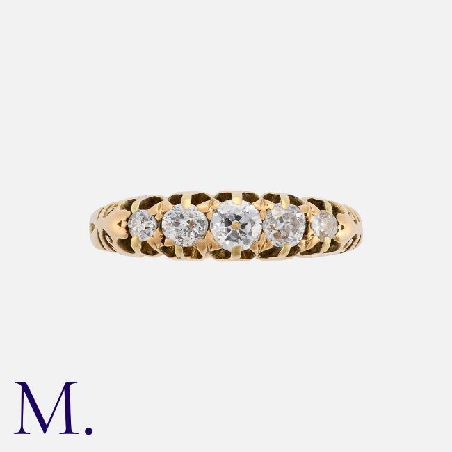 An Old Cut Diamond Five Stone Ring in 18k yellow gold, set with five graduated old cut diamonds totalling approximately 0.55ct. Marked 18ct. Size: K Weight: 3.0g.